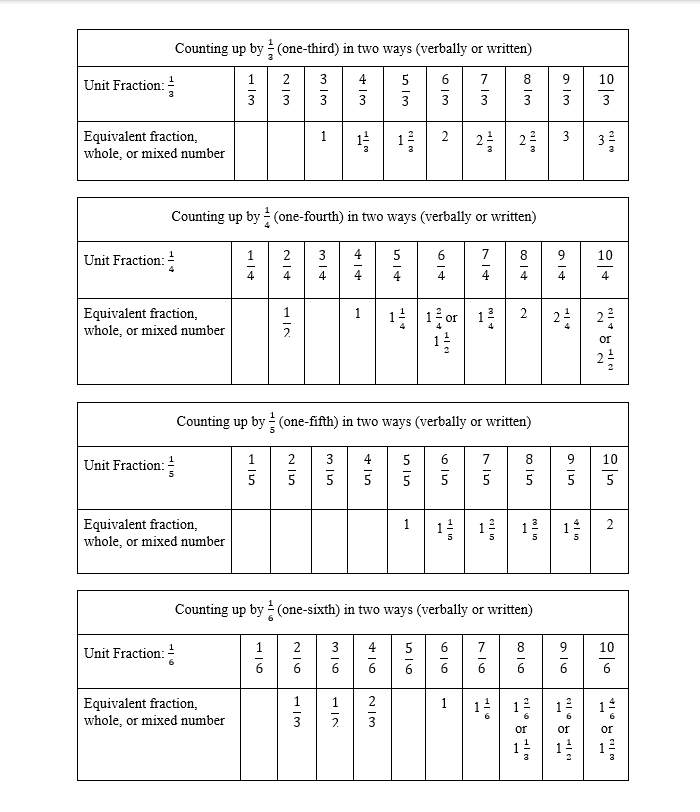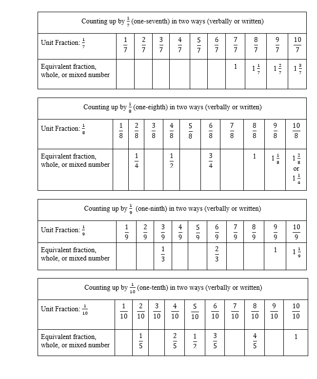In 4th grade, fractions instruction expands to include equivalent fractions, comparing and ordering fractions, and basic operations (especially addition and subtraction of like denominators). Students are also introduced to mixed numbers and fractions greater than one (formerly known as improper fractions).
