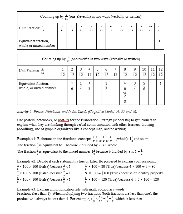 Keywords: Cognitive Load Theory (CLT), cognitive models, Cognitive Science, Concrete Representational Abstract (CRA) approach, Dual Coding Theory (DCT), elaboration, fractions, interleaved practice, retrieval practice, spaced practice, swarm intelligence (SI).