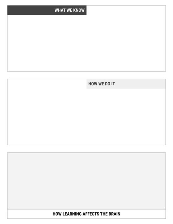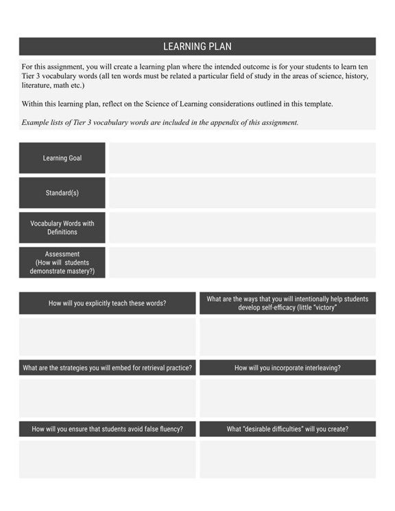 Learning Journey Narrative Participants in this course will first reflect on their own experience as learners by writing a personal narrative that captures their learning journey both inside and outside of the classroom. This retrospective activity will prompt participants to think about their relationship with learning new information, the ways in which learning felt most natural and most challenging to them, and how they would describe an ideal learning environment. This narrative will allow participants to establish their existing beliefs on learning, so that as this unit develops the most effective learning strategies, they will be able to consider this information in light of their personal backgrounds. Science of Learning Infographic As we gain momentum in this unit and cover the most effective strategies for learning (as well as dispel common assumptions on learning that are not true), participants will gradually develop a set of infographics that respectively cover effective learning strategies and ineffective learning strategies. This infographic will have participants synthesize their understanding of how learning works and also serve as a mental model for the Learning Plan that they will create. Learning Plan Participants will create a Learning Plan by first choosing a learning goal that involves learning ten new vocabulary words. Participants will create bite-sized action steps that work towards mastery of this learning goal and include a side-by-side rationale for the learning strategies that are embedded into this plan. Learning Journey Narrative, Revisited Participants will return to their Learning Journey Narrative and write an addendum where they reflect on how this unit deepened their understanding of how people learn and if there are any shifts they’d like to make in their practice as a result.