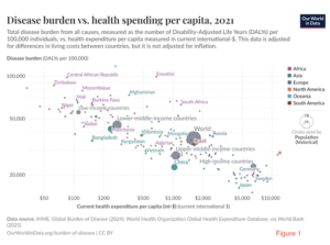 Our in-class lectures began by clarifying the relationship between disability and function, in context. Health-related challenges due to chronic illnesses and disabilities significantly impact individuals’ quality of life (including life expectancy) and societal participation. The World Health Organization reports that noncommunicable diseases (including cardiovascular diseases, cancer, diabetes, and chronic respiratory diseases), now account for 75% of all global deaths.[1] These conditions disproportionately affect low- and middle-income countries, where healthcare infrastructure may be most limited. According to the NCD Letter Letter to National Advisory Council on Minority Health and Health Disparities, many survivors of such diseases in America live with long-term physical and mental well-being impairments, exacerbating social and health disparities, especially where therapy and assistive services are biased or scarce.[2] The correlation between per-capita healthcare spending and “Disability Adjusted Life Years”[3] is well-demonstrated in the following chart (see figure 1). The more we spend, the longer people live. Of course, preventative care and physical therapy contribute to better health and financial outcomes in the long run.