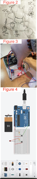 We also explored a hypothetical “What if she needed a better button?” problem. Our case study wanted to play with a toy, but the switch was just too difficult to use. We used Tinkercad[18] (see figure 3) to plan for an interaction between a breadboard, an arduino, and various circuits, an LED light, and a button. At the same time, we built a similar system with physical versions of the aforementioned items, and a bunny toy with a too-small switch (see figure 4, image by Alyson Iovacchini). It was quite a thrilling experience to push the button and be startled by my bunny’s wild sound and movement. I imagine that a child who was once unable to do this independently would feel the same joy at finally making it happen.