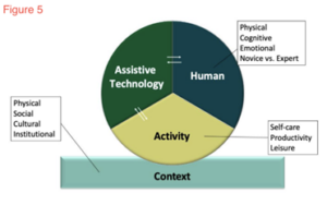 Students will become familiar with the HAAT model[34] (see figure 5) in order to make a claim by finishing the sentence “___ will need ___ so they can ____.” Since their claim must be supported by evidence, and they are new to this topic, they will leave it as an incomplete prompt while mining their two-paragraph blurbs for crucial details and filling out a simple chart. Then they’ll do individual sketches of the products they proposed. The collaborative HAAT activity will segue into lesson five, for some structured research on their individuals’ disability or ways to evaluate it (for example, the Gross Motor Function Measure[35]). It’s important to provide graphic organizers while they do this work, so they have an easy reference point while defining the problem[36] (see appendix 8). After researching, they will reiterate their product sketches together, and build their first prototype. They can do these steps manually, or digitally with Tinkercad (a web app for 3D design, electronics, and coding) and 3D printers if available.