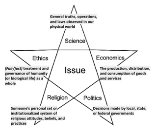 We will then use a “star” chart to explore the scientific, political, economic, religious, and ethical aspects of the issue; this is a way of eliciting prior knowledge and making relevant cross-curricular connections. Students are likely to know very little at this time. I have found that after teaching for years in this way, they get better at inferencing possible viewpoints instead of just looking things up, finding an answer, and thinking they’re finished. If students do this in groups, it’s a form of productive talk. It also gives the teacher time to walk around the room and listen or ask questions. They see that science touches all aspects of life and does not exist in a vacuum, and is often not neutral.